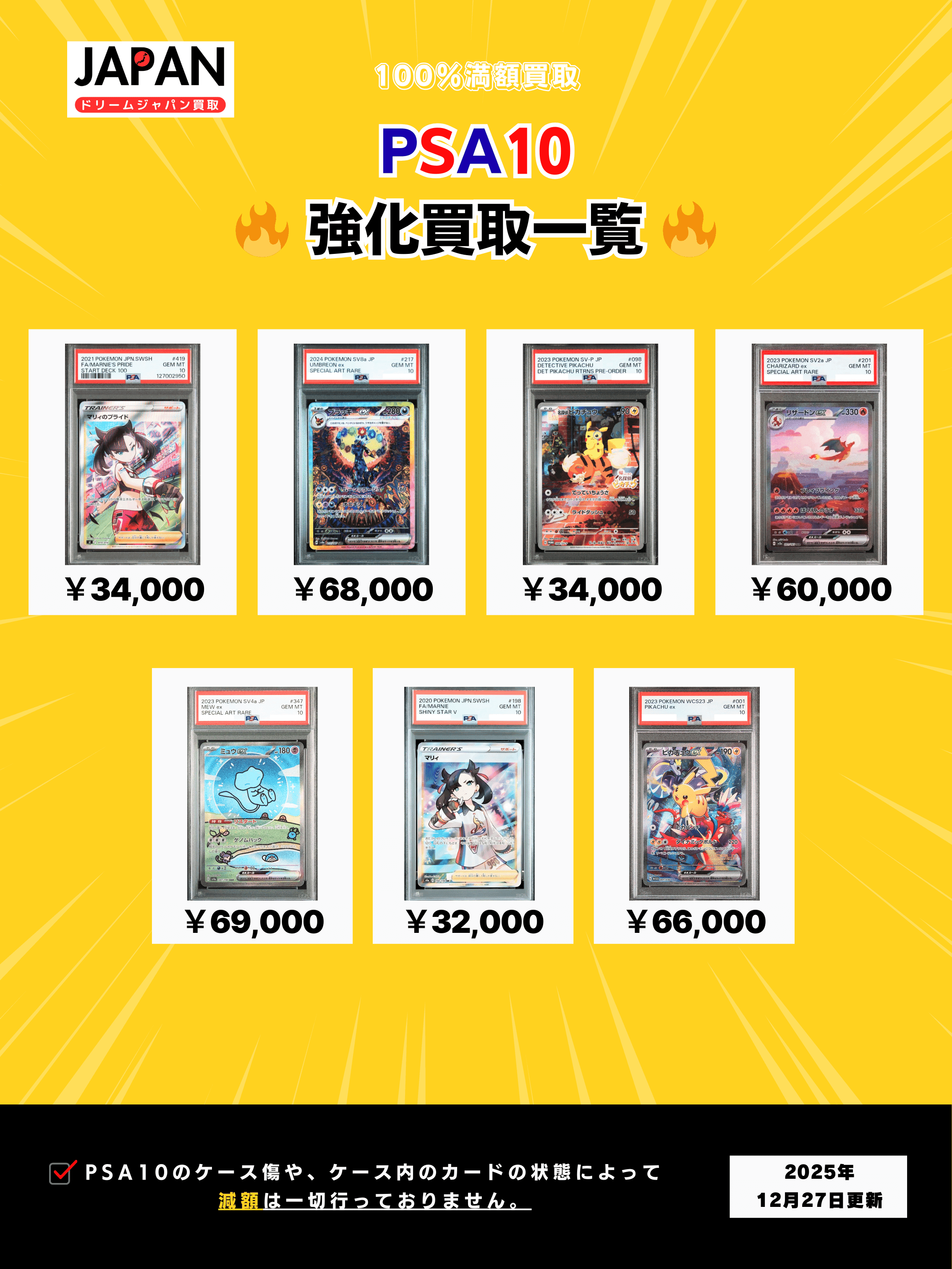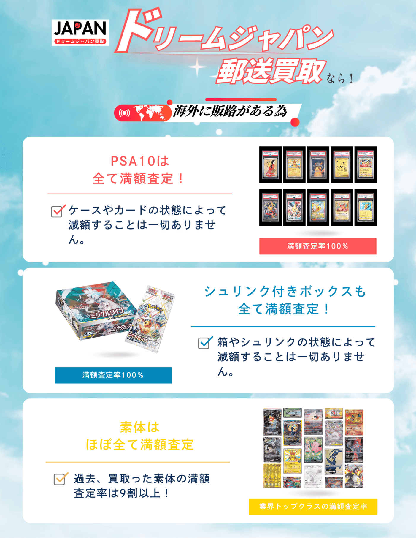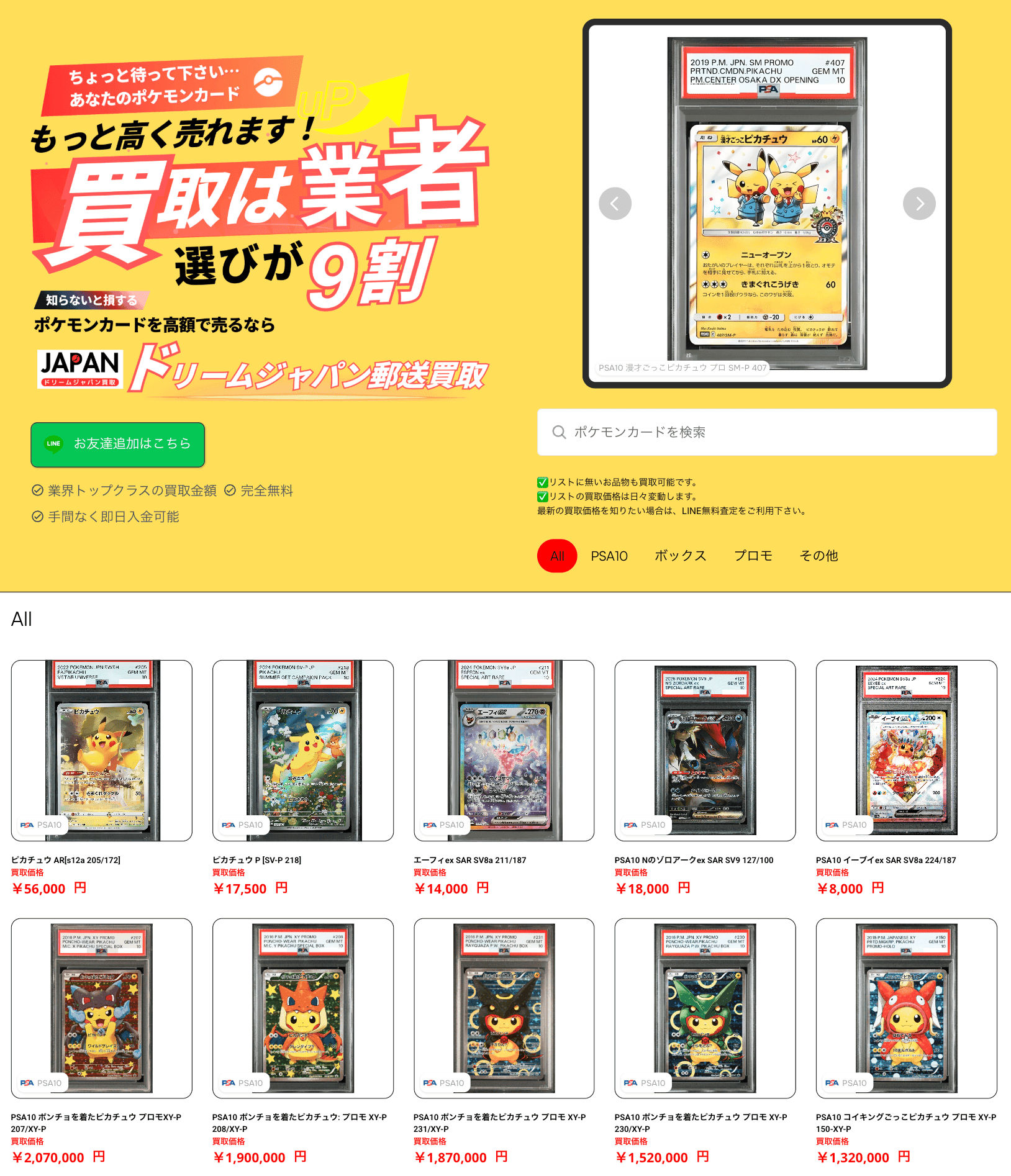 主にポケモンカード専門で、PSA鑑定品、素体、ボックス等を買取しています。