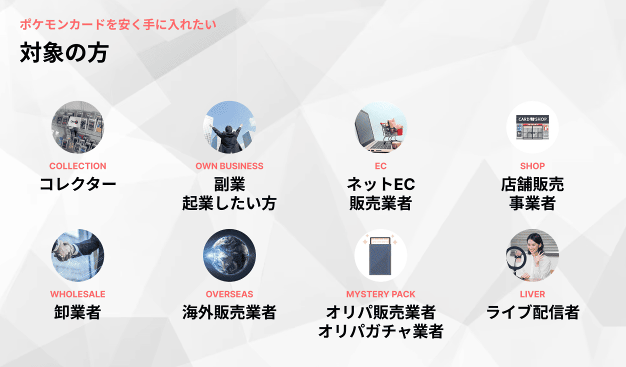⓵【卸サイトの運営】一般顧客から買取したポケモンカードを、業者やコレクター向けに卸販売